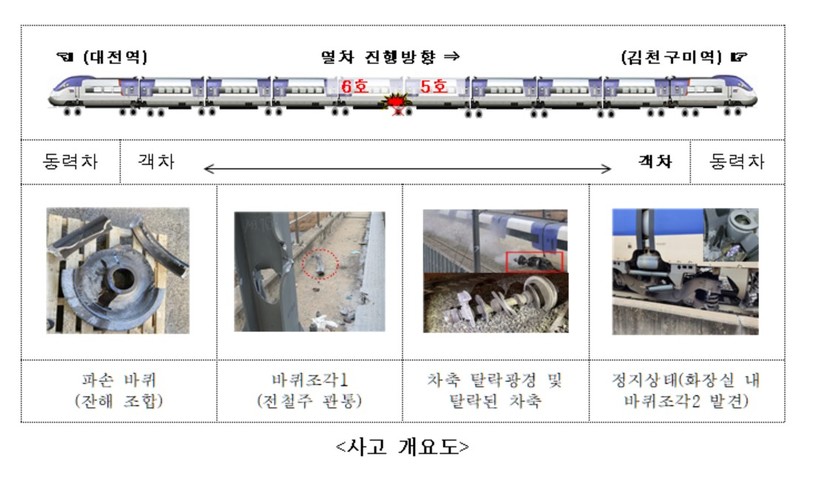 사조위에 따르면 사고열차는 약 285㎞/h의 속도로 운행 중 서울역 기점 193㎞ 지점에서 열차 진행방향 중간부(5번째와 6번째 차량 사이) 대차의 2번째 차축 오른쪽 바퀴(이하 사고바퀴)가 파손돼 궤도를 이탈했다.