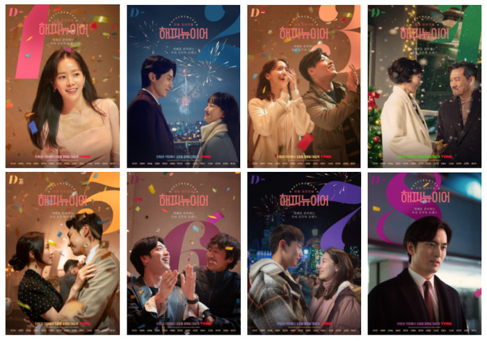 올해의 마지막을 장식할 로맨스 영화 '해피 뉴 이어'의 D-day 캐릭터 포스터는 “새해를 준비하는 우리 모두의 로맨스”라는 카피와 함께 소중한 사람들과 새해를 맞이하는 인물들의 잊지 못할 순간을 담아내 이목을 집중시킨다. 운명의 남자로부터 고백을 받게 될 거라는 운세를 듣고 가슴 설레는 호텔 매니저 ‘소진’(한지민), 예기치 못한 사랑에 점차 빠져드는 호텔 엠로스의 대표 ‘용진’(이동욱)과 하우스키퍼 ’이영’(원진아), 호텔 엠로스의 문제적 투숙객 ‘재용’(강하늘)과 담당 호텔리어 ‘수연’(임윤아)의 뜻밖의 만남, 40년 만에 다시 만난 옛사랑 ‘캐서린’(이혜영)과 ‘상규’(정진영), 꿀 떨어지는 눈빛으로 서로를 바라보는 예비부부 ‘승효’(김영광)와 ‘영주’(고성희), 오랜 기간 동고동락하며 끈끈한 브로맨스를 자랑하는 가수 ‘이강’(서강준)과 그의 매니저 ‘상훈’(이광수), 풋풋한 첫사랑을 이제 막 시작한 ‘세직’(조준영)과 ‘아영’(원지안), 호텔 엠로스에서 자신의 인연을 손꼽아 기다리는 ‘진호’(이진욱)까지. 각자의 방식으로 새해 카운트다운을 기다리는 14인의 모습은 보는 이들까지 행복하게 만들며 새로운 연말 시즌 무비의 탄생을 예고한다.