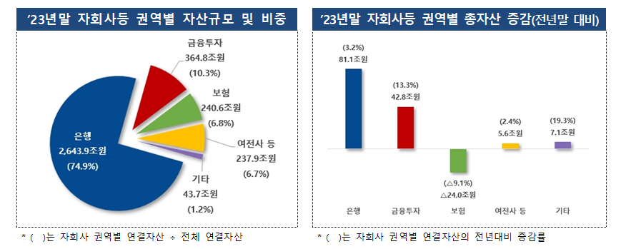 금융지주회사 총자산 대비 자회사 등 권역별 자산 비중은 은행이 74.9%(전년말 75%, -0.1%p)로 가장 높았고, 금융투자 10.3%(전년말 9.4%, +0.9%p), 보험 6.8%(전년말 7.7%, -0.9%p), 여전사 등(카드, 캐피탈, 저축은행 등 포함) 6.7%(전년말 6.8%, -0.1%p)를 차지했다.