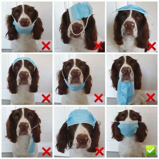 [하비엔=박명원 기자] 최근 한 사회관계망서비스(SNS)에는 올바른 마스크 착용법이라는 게시물 올라왔는데 다양한 형태로 마스크를 착용한 스프링거 스패니얼의 모습을 보여주고 있다.