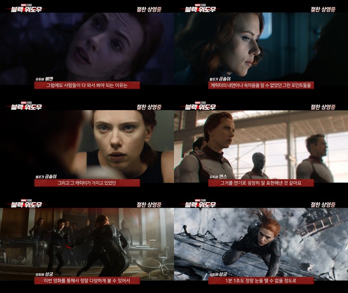 먼저, 드디어 밝혀진 <블랙 위도우>의 진짜 이야기에 대해 "캐릭터의 내면이나 속마음을 알 수 없었던 그런 포인트들을 이번 영화에서 전부 만나볼 수 있었다"(블로거 곰솔이), "블랙 위도우라는 히어로가 어떻게 지금까지 성장해 왔는지 굉장히 잘 표현해낸 것 같다"(유튜버 엔스) 등 높은 만족도를 드러내 영화의 스토리에 대한 궁금증을 자극시킨다. 이어 지상과 공중을 오가는 압도적인 액션 장면들에 대해 "블랙 위도우만이 가지고 있는 우아하고 날렵한 특유의 액션씬이 이번 영화를 통해서 정말 다양하게 볼 수 있다"(유튜버 상궁), "블랙 위도우가 할 수 있는 진짜 모든 것을 다 보여준 것 같다"(블로거 럽카키) 등 폭발적인 반응을 보여 기대감을 배가시킨다. 마지막으로 이번 작품을 통해 새롭게 등장한 캐릭터들에 대해 "정말 매력적인 새로운 캐릭터들"(블로거 아로니안), "이 조합을 정말 잘 만들었고 앞으로도 이 캐릭터들이 어떻게 이 유니버스 안에서 역할을 하는지 너무 궁금해진다"(유튜버 삐맨) 등 개성 넘치는 캐릭터들의 케미에 대해 호평을 전해 기대감을 드높인다.