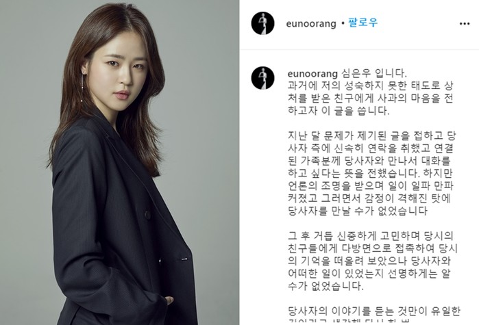 지난 28일 심은우는 자신의 인스타그램에 "과거 저의 성숙하지 못한 태도로 상처를 받은 친구에게 사과의 마음을 전하고자 이 글을 쓴다"고 글을 시작했다.