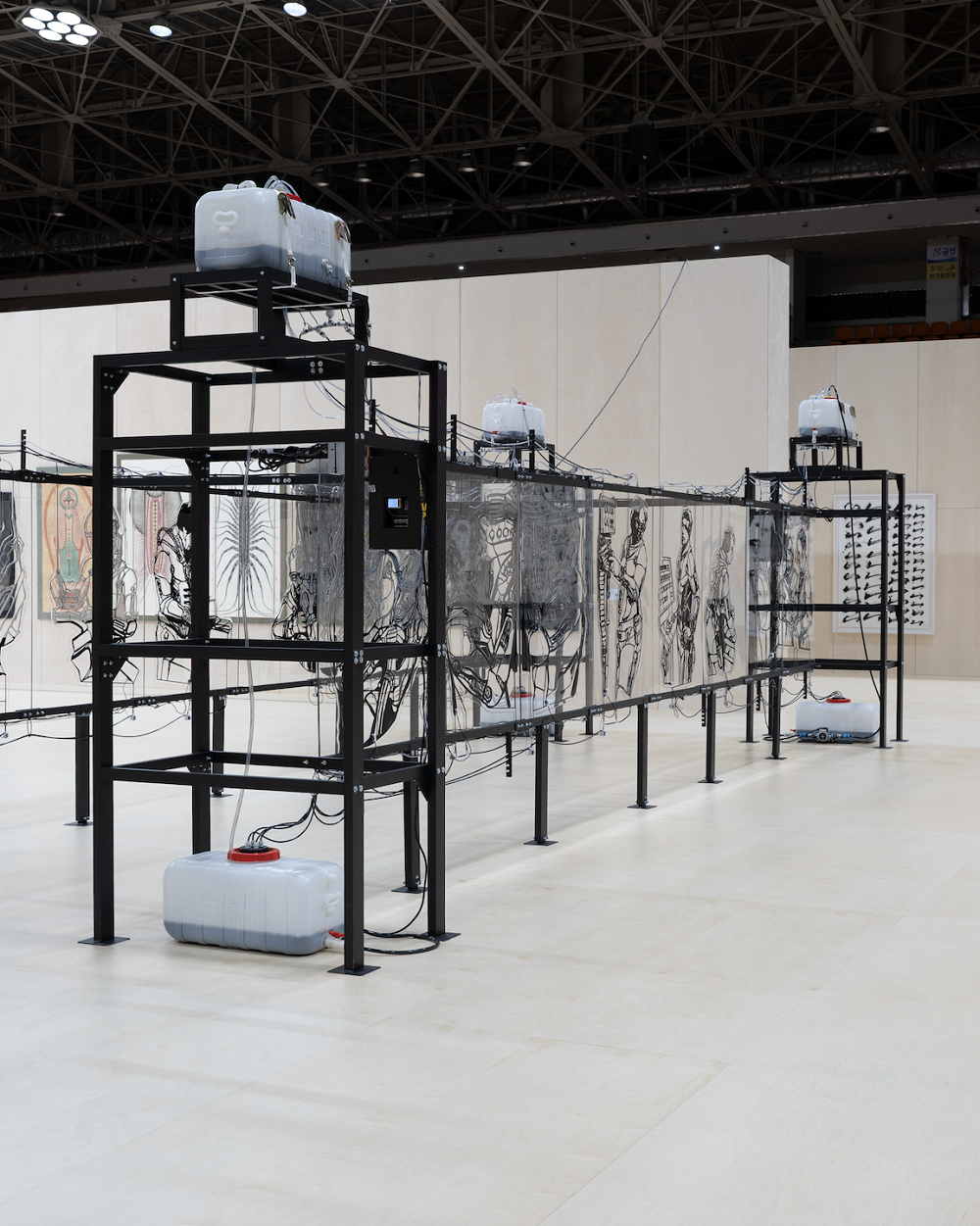 야시엘스키는 지난해 제15회 광주비엔날레 폴란드관에서 선보였던 대형 키네틱 설치작품 '(나를) 기억해줘 Remember(me)'를 이번 수묵비엔날레에서도 다시 소개한다. 작품은 인간과 기계의 관계 변화를 복고적 미래주의 관점에서 풀어내며, 유압 장치로 아크릴판 홈을 따라 흐르는 검은 액체가 점차 노동자의 형상을 드러내는 방식으로 전개된다. 작가가 개발한 ‘루시도그래피(Lucidography)’ 기법을 활용한 이 작업은 산업화와 미디어 담론 속 기계적 유토피아를 시적이면서도 비판적으로 성찰한다.