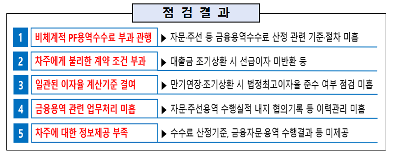 특히 대출이자 성격의 수수료와 차주가 금융회사에 위임한 업무에 대한 대가 성격의 수수료가 혼재돼 있었고, 금융사의 PF 자문·주선 용역 수수료 수취 시 자체적인 수수료 산정 기준과 절차가 미흡한 것으로 조사됐다.