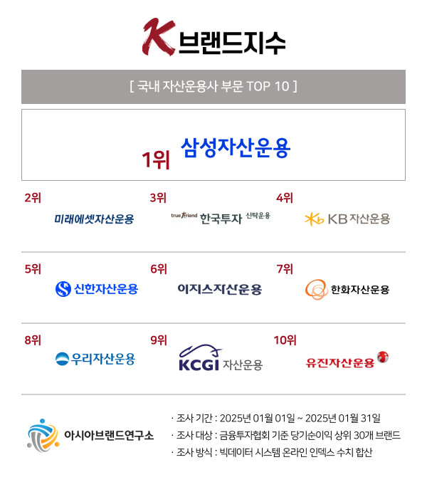 한정근 아시아브랜드연구소 대표는 “이번 조사에서 삼성자산운용은 미래에셋자산운용을 제치고 ‘K-브랜드지수’ 자산운용사 부문 1위를 차지했다”며 “특히 김우석 대표 취임 이후 단행된 조직 개편이 글로벌 ETF 시장 공략에 긍정적 요인으로 평가받고 있다”라고 설명했다.