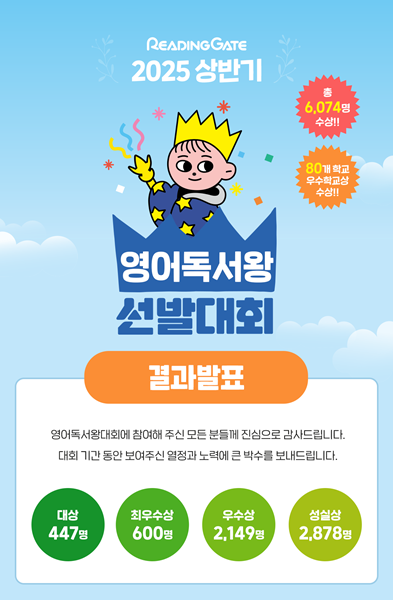 [하비엔뉴스 = 정동환 기자] 에듀테크 전문기업 리딩게이트는 2025 상반기 영어독서왕 선발대회를 성황리에 마치고 최종 결과를 17일 발표했다.