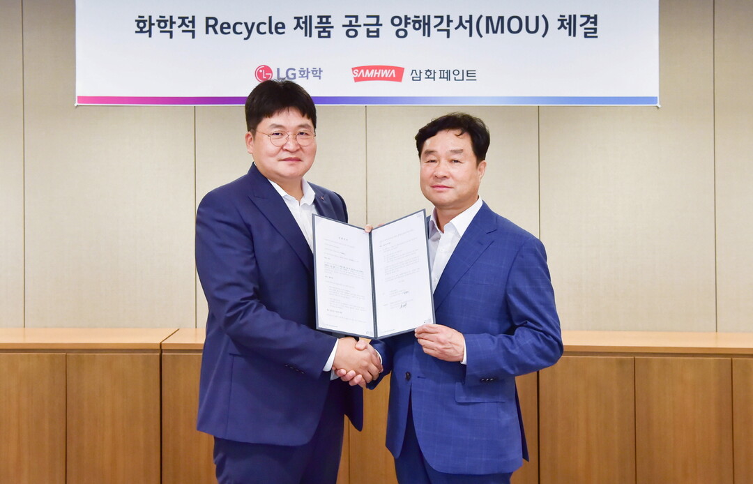 LG화학은 지난 8일 여의도 LG트윈타워에서 삼화페인트와 폐플라스틱 기반의 화학적 재활용 원료 공급에 대한 업무협약을 체결했다고 9일 밝혔다.