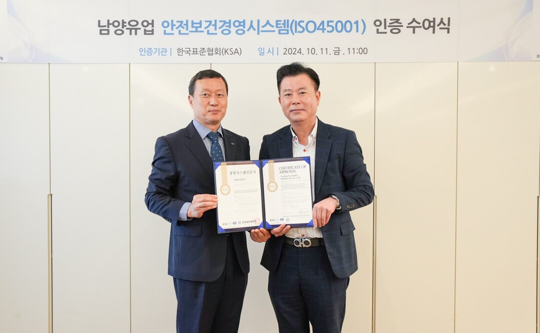 남양유업은 사업장 위험성 평가, 안전보건 교육 강화, 중대재해처벌법 준수, 근로자 협의 및 참여활동을 통해 전사 안전보건 경영 시스템을 구축한 노력을 인정받았다. 이에 지난 11일 서울시 강남구 본사 대회의실에서 한국표준협회(KSA) 관계자들과 함께 인증 수여식을 진행했다.