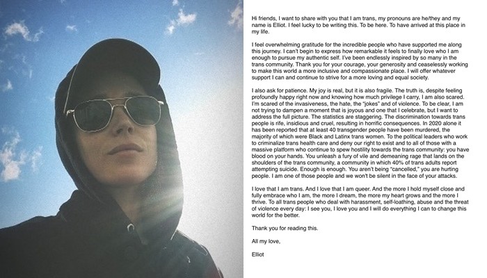 1일(현지 시각) 엘렌 페이지는 자신의 페이스북에 "안녕 여러분. 나의 성전환 사실을 알리고 싶다. 이제 내 대명사는 'he/they'고 내 이름은 엘리엇이다. 이런 글을 쓰게 되다니 운이 좋은 것 같다"며 글을 남겼다.