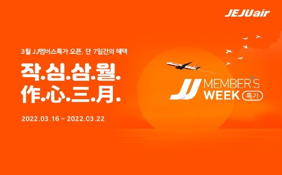 한편 제주항공은 ‘JJ멤버스위크’ 기간 동안 국제선 항공권을 구매하는 고객을 대상으로 1회에 한해 일정 변경 수수료를 면제해 준다. 단, 일정 변경 시 기존 구매한 운임과 차액이 생기면 추가 부담해야 한다.