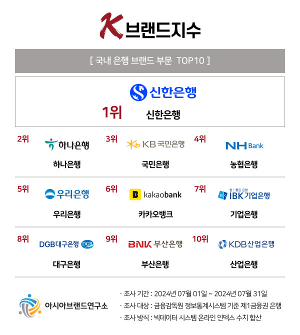 | ‘K-브랜드지수’ 국내 은행 부문 톱10. [자료=아시아브랜드연구소] |