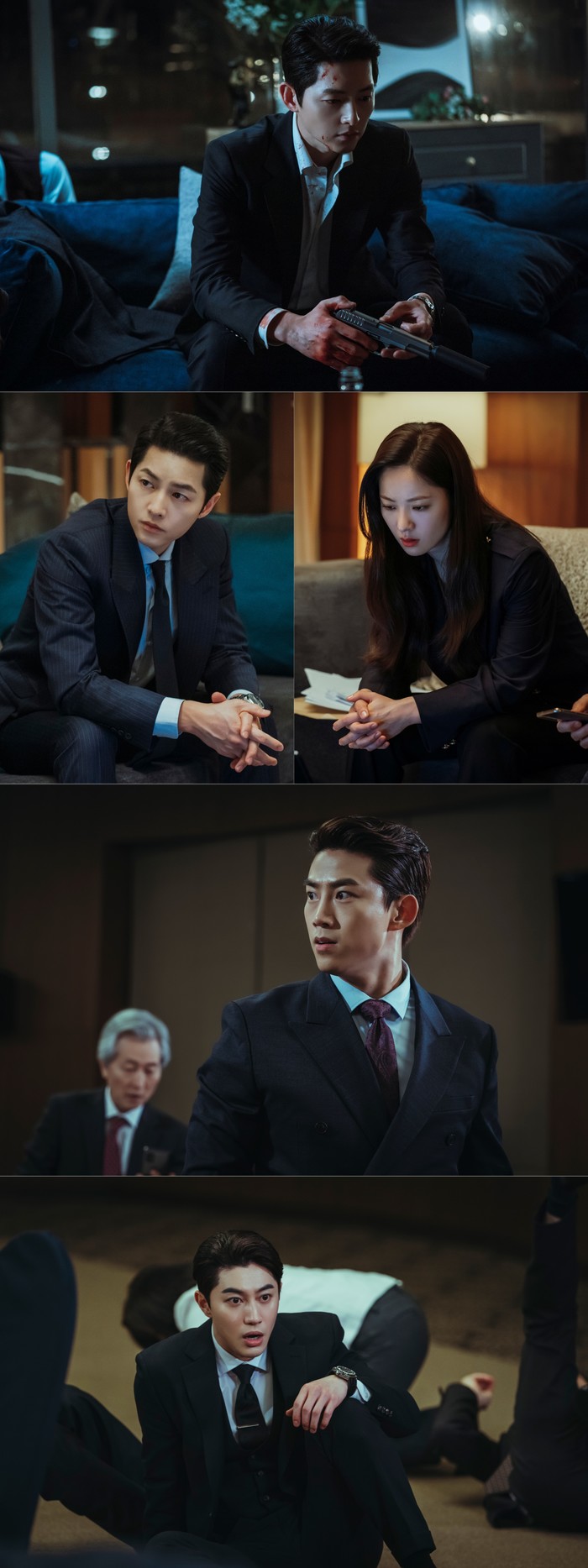 이날 공개된 사진 속 빈센조의 살기는 단번에 시선을 옭아맨다. 이제껏 본 적 없는 모습으로 돌변한 빈센조가 빌런들을 확실하게 응징할 수 있을지 궁금해진다. 이어진 사진에는 새로운 작전을 펼치는 빈센조와 홍차영의 모습이 담겼다. 긴장된 얼굴로 무언가를 응시하는 홍차영의 모습은 더 뜨겁게 휘몰아칠 파이널 라운드의 시작을 알린다. 아수라장 속 당황한 기색이 역력한 장준우, 장한서(곽동연 분)의 모습 역시 긴장감을 드리운다. 과연 빌런들의 판을 뒤엎을 다크 히어로의 다음 작전은 무엇일지, 절정에 치달은 이들의 싸움에 귀추가 주목된다.