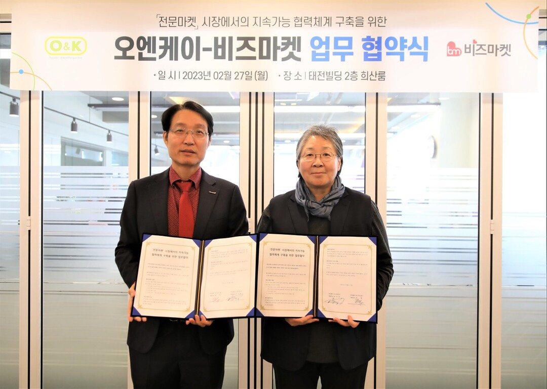 이번 협약식에는 강오순 오엔케이 대표와 허탁 비즈마켓 대표 등이 참석해 전문 마켓시장에서의 지속 가능한 협력 체계를 구축해 사업을 추진하기로 뜻을 모았다.