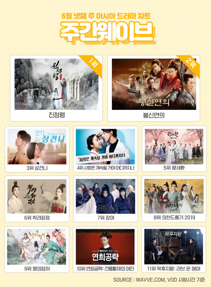 22일 주간웨이브 아시아드라마 차트에 따르면 무협 드라마 '진정령'과 '봉신연의'가 각각 1,2위를 차지했다. 두 작품 모두 중국 현지에서도 큰 인기를 끌었다.