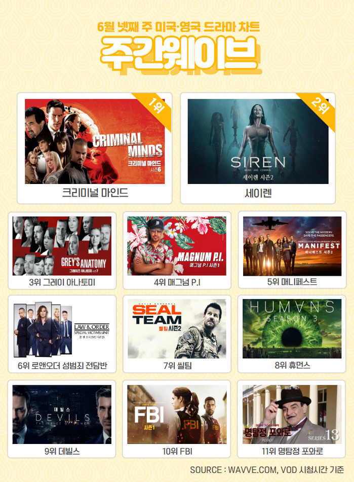 주간웨이브 미국영국 드라마 차트에서 3주 연속 1위를 달리고 있다. 지난 주 5위를 기록했던 웨이브 최초 공개작 '세이렌'은 단숨에 2위로 치고 올랐다.
