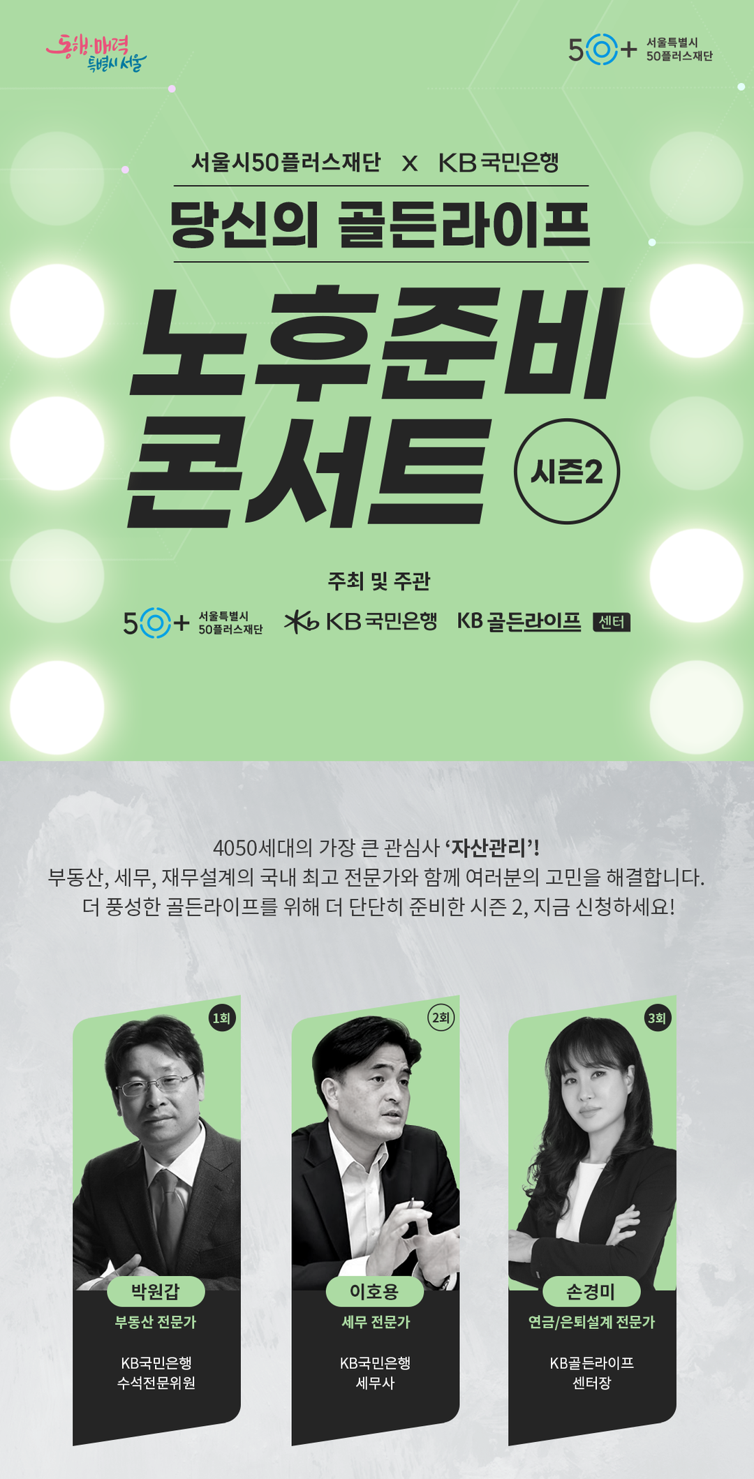 세미나 참여 신청은 ‘KB골든라이프X’와 ‘서울시50플러스재단’ 사이트에서 오는 19일까지 받는다. KB골든라이프 카카오톡 채널에 가입하면 별도 신청절차 없이 행사 당일 생방송 시청을 위한 링크를 받게 된다.