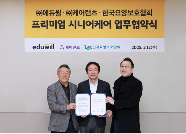 케어런츠는 지난 12일 서울 구로구 에듀윌 본사에서 에듀윌·한국요양보호협회와 업무협약을 체결했다고 13일 밝혔다. 이날 협약식에는 박지성 케어런츠 대표와 양형남 에듀윌 대표, 박한식 한국요양보호협회 회장이 참석했다.