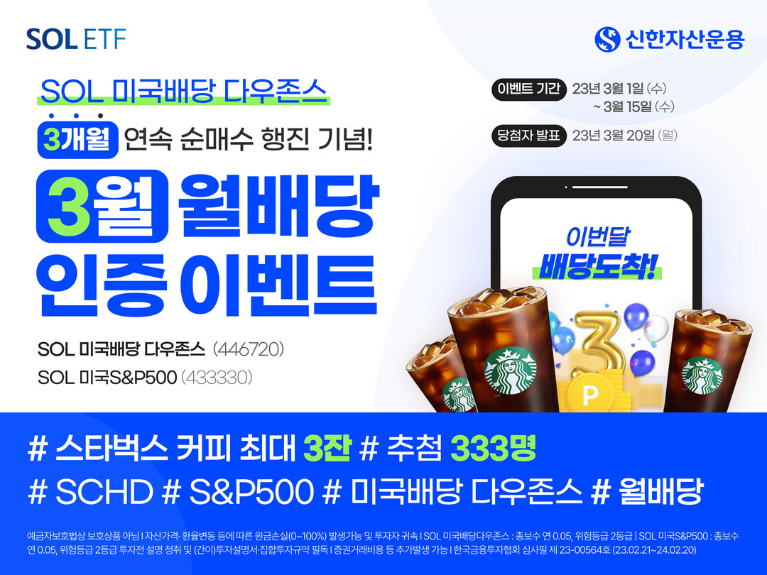 이번 이벤트는 오는 3월2일부터 15일까지 SOL ETF 블로그를 통해 진행된다. 신한자산운용은 이벤트 페이지에 SOL 미국S&P500과 SOL 미국배당다우존스 월 배당 인증사진과 이름과 연락처를 등록한 투자자 가운데 333명에게 스타벅스 아메리카노 기프티콘을 선사한다.