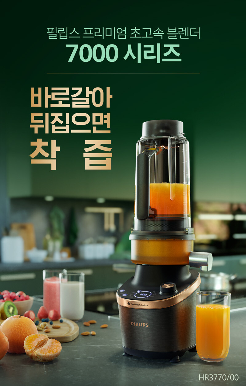 예능 프로그램을 통해 ‘천재 믹서기’로 알려진 ‘필립스 블렌더 7000’은 130년 전통의 필립스가 올해 처음 선보인 신상품으로, 블렌더 라인업 가운데 최고 사양을 갖추고 있다. 특히 주스 추출 모듈이 있는 필립스 최초의 고속 블렌더 제품으로, 초고속 블렌더와 착즙기를 하나로 합쳐 블렌딩 후 용기 교체 없이 착즙까지 가능하다.