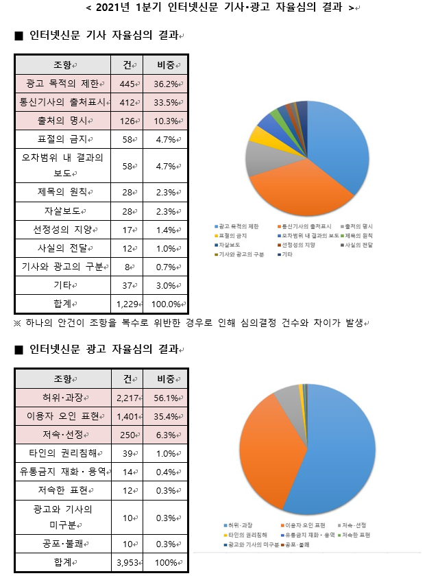 [하비엔=노이슬 기자] 인터넷신문위원회(위원장 방재홍, 이하 인신위)가 참여 서약매체들을 대상으로 실시한 기사 및 광고에 대한 1분기 자율심의 결과를 22일 발표했다.