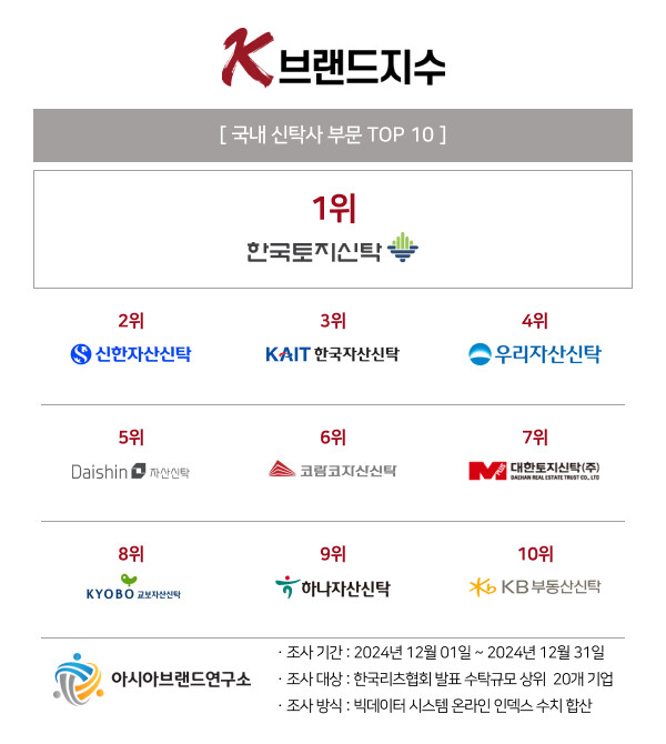 한정근 아시아브랜드연구소 대표는 “한국토지신탁이 K-브랜드지수 1위를 수성하며 존재감을 입증했다”며 “특히 신한자산신탁과 한국자산신탁이 상위권으로 급부상한 반면 코람코자산신탁과 교보자산신탁의 하위권 추락은 눈여겨볼 필요가 있다”라고 말했다.