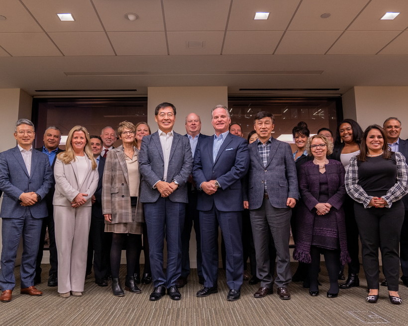 | ▲ 신학철 부회장(앞줄 왼쪽 네 번째)와 마이클 베일리 아베오 대표(신 부회장 옆), 손지웅 사장(앞줄 맨 왼쪽)이 양 사 임직원들과 함께 기념촬영을 하고 있다. [사진=LG화학] |