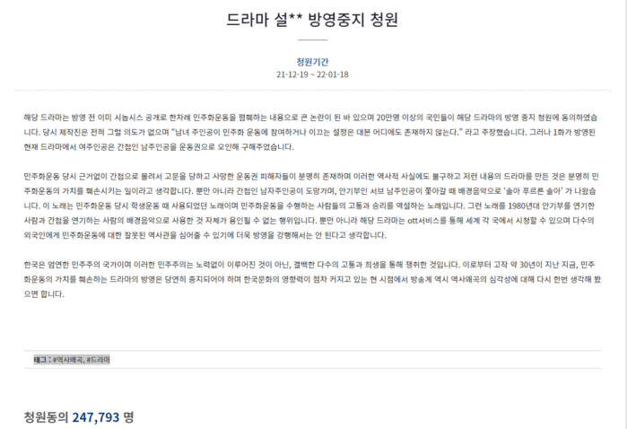 또 글쓴이는 "한국은 엄연한 민주주의 국가이며 이러한 민주주의는 노력없이 이루어진 것이 아닌, 결백한 다수의 고통과 희생을 통해 쟁취한 것입니다. 이로부터 고작 약 30년이 지난 지금, 민주화운동의 가치를 훼손하는 드라마의 방영은 당연히 중지되어야 하며 한국문화의 영향력이 점차 커지고 있는 현 시점에서 방송계 역시 역사왜곡의 심각성에 대해 다시 한번 생각해 봤으면 합니다"라고 강조했다.