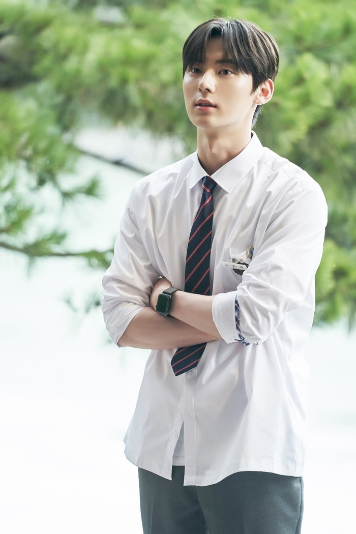 공개된 사진 속 황민현(고은택 역)은 조각같은 비주얼과 흰 교복 셔츠에 살짝 걷어 올린 소매로 순정만화에서 뛰쳐나온 듯한 느낌을 풍기고 있다. 꽉 채운 단추, 흐트러짐 없이 멘 넥타이, 손목시계까지 학창시절 기억 속 누구나 한번 쯤 있었던 것만 같은 완벽한 남학생 캐릭터로 분해 많은 이들을 심쿵하게 만들고 있는 것.