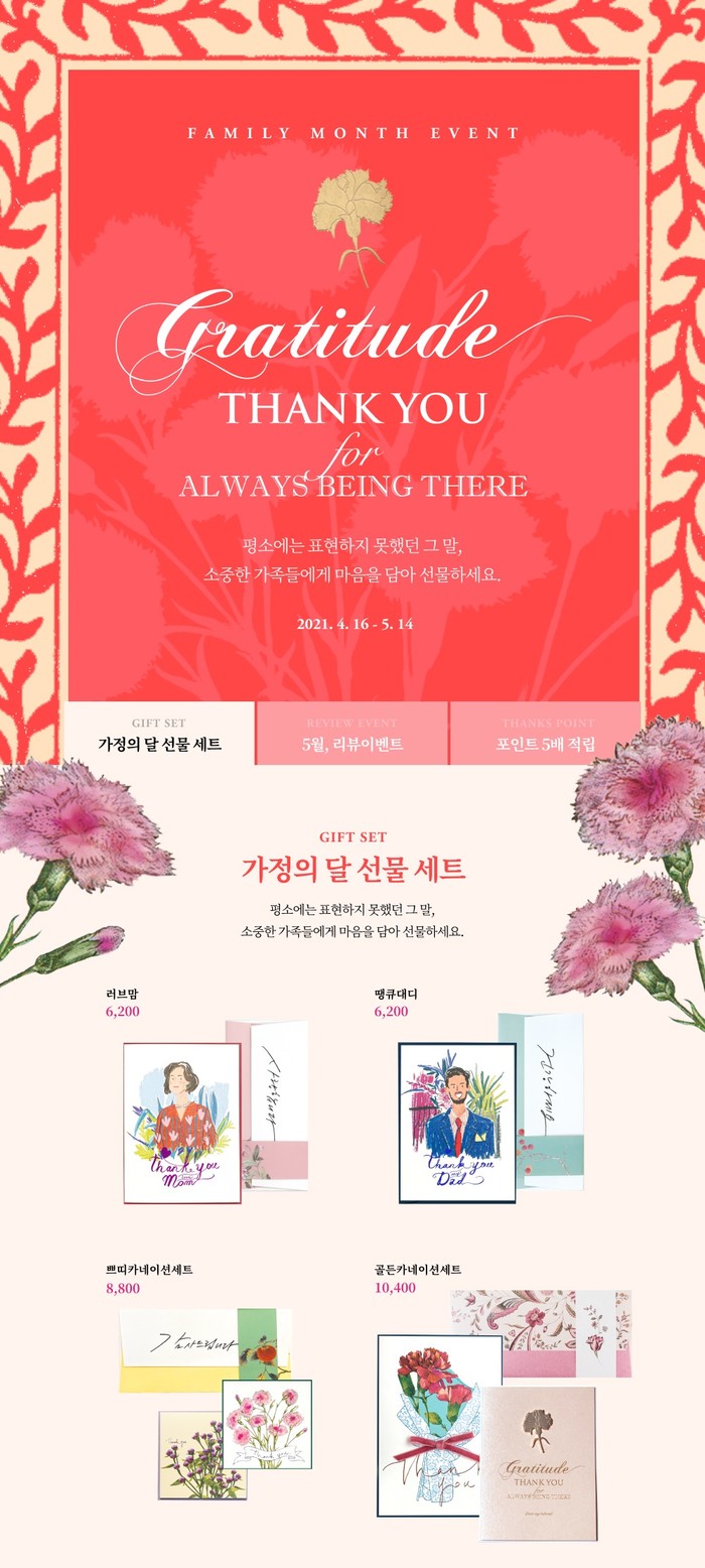 케이페이퍼가 직접 디자인한 카드와 돈 봉투로 구성된 가정의 달 선물 세트는 ‘러브 맘 세트’부터 ‘땡큐 대디 세트’, ‘쁘띠 카네이션 세트’, ‘골든 카네이션 세트’까지 특별한 구성의 제품을 합리적인 가격으로 만나볼 수 있다.