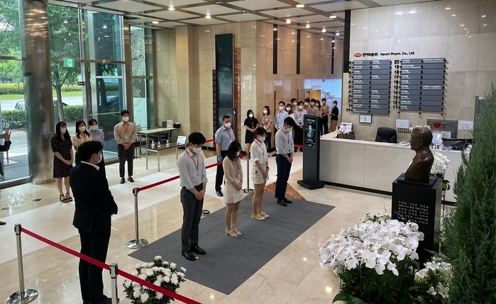 | ▲故 임성기 한미약품그룹 회장 영면 1주기인 지난 2일 서울 송파구 한미약품 본사 로비의 임 회장 흉상 앞에서 사원들이 묵념하고 있다.(사진:한미약품그룹) |