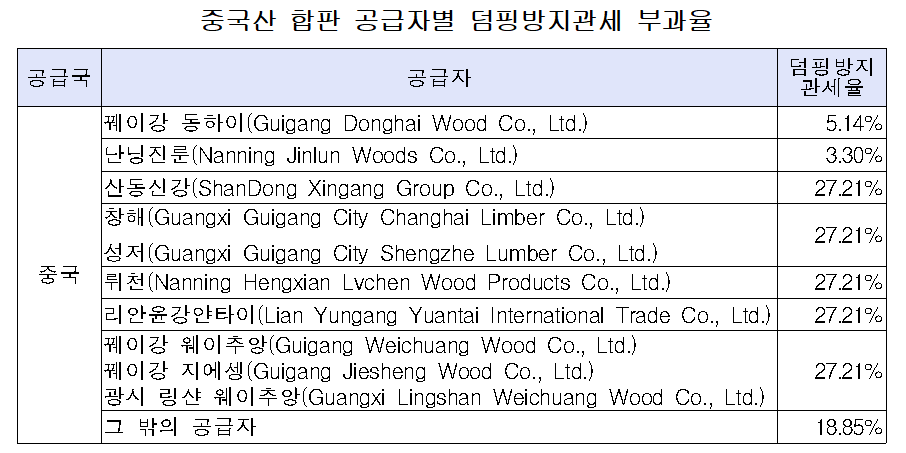 | 중국산 합판 공급자별 덤핑방지관세 부과율. [자료=산업통상자원부] |