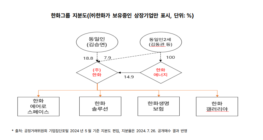 한화에너지는 지난 7월26일 한화 지분 5.20%를 매입해 지분율을 48.76%로 늘렸다. 한화에너지는 김승연 회장의 3남인 김동관 한화그룹 부회장(지분율 50%)과 김동원 한화생명 사장(25%), 김동선 한화갤러리아 부사장(25%)이 100% 지분을 보유하고 있다.