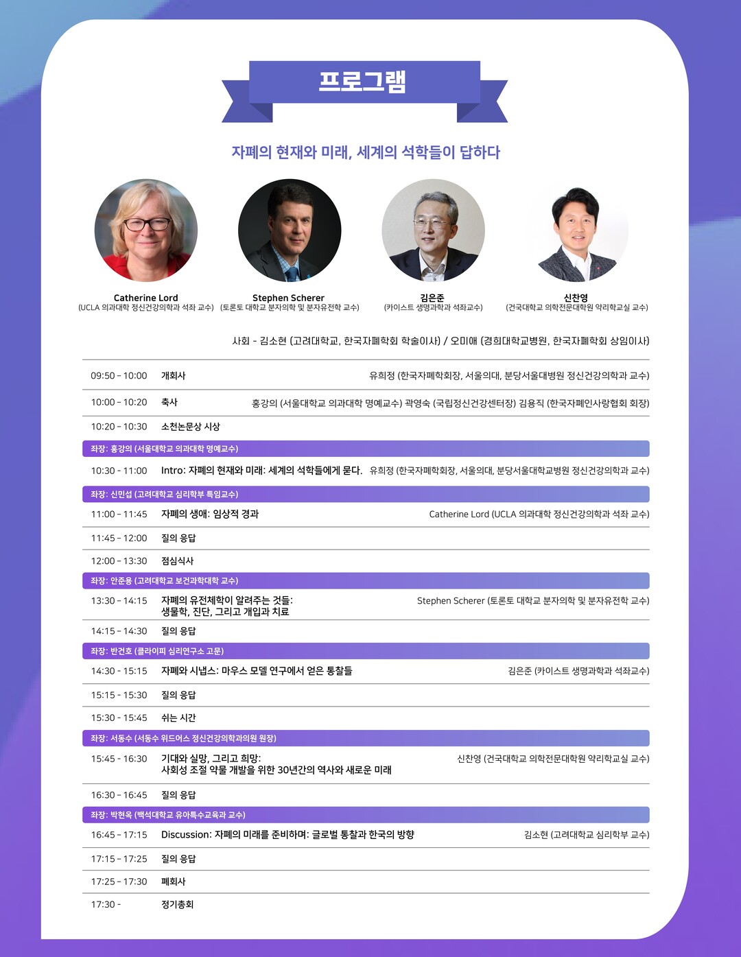 이번 학술대회는 자폐의 전 생애를 아우르는 최신 연구와 치료와 지원 전략을 다룰 예정이다. 첫 세션에서는 캐서린 로드(Catherine Lord) UCLA 의과대학 정신건강의학과 교수가 ‘자폐의 생애: 임상적 경과’를 주제로 자폐 진단 도구 개발과 임상 경과 연구 성과를 소개한다. 이어 스티븐 쉬어러(Stephen Scherer) 토론토대 분자의학 및 분자유전학 교수는 ‘자폐의 유전체학이 알려주는 것들’을 통해 유전체 분석을 통한 진단 및 개입 가능성을 제시한다.