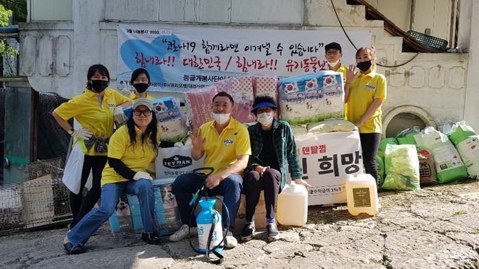 그런 둥글개 봉사단이 코로나19로 힘들어 하는 대한민국의 안녕을 위해 지난 3월부터 매월 많은 사람들이 이용하는 공공시설이나 유기동물 보호소에 방역활동 및 유기동물 보호소 후원 활동을 하고 있다.