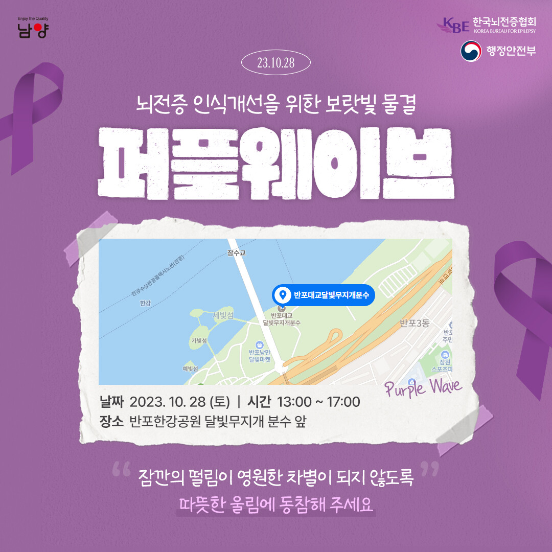 [하비엔뉴스 = 홍세기 기자] 남양유업이 오는 28일 서울 반포한강공원에서 뇌전증 인식 개선을 위한 ‘보랏빛 물결, 퍼플웨이브’ 캠페인을 펼친다.