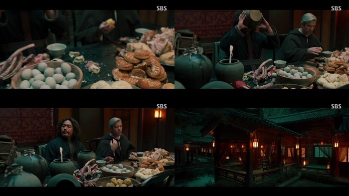 이들은 해당 기생집에서 술과 음식으로 허기를 달랬다. 이때 상 위에는 통상적인 조선 먹거리가 아닌 오리알, 월병, 만두 등 중국풍의 음식들이 올라와 논란을 빚었다. 또한 해당 기생집은 중국의 객잔을 연상케하며, 홍등가의 분위기가 더 짙어 이 또한 지적받았다.