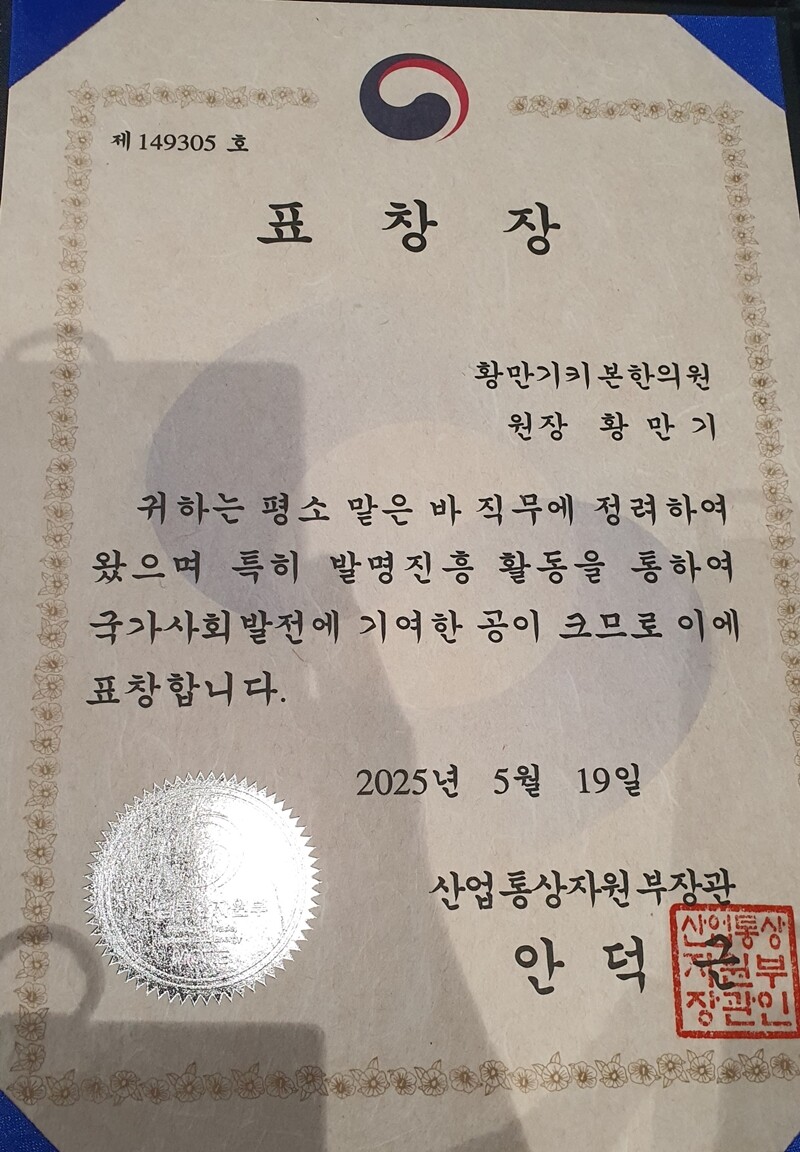 황만기 박사는 ‘키(뼈)성장·골절·골다공증·아토피·인지기능 향상(총명) 치료용 식물성 천연물(한약) 기반 핵심 원천기술 개발을 통하여 국민 보건산업의 발전 및 국민건강 증진에 기여’한 것을 발명진흥 공적으로 공인(검증)받아서, 이번에 산업통상자원부 장관 표창을 수상했다.