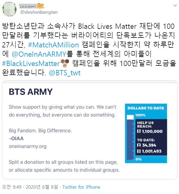 8일 오전 트위터 아이디 @***setbangtan 사용자는 "방탄소년단과 소속사가 Black Lives Matter 재단에 100만달러를 기부했다는 버라이어티의 단독보도가 나온지 27시간, #MatchAMillion 캠페인을 시작한지 약 하루만에 @OneInAnARMY를 통해 전세계의 아미들이 #BlackLivesMatter 캠페인을 위해 100만달러 모금을 완료했습니다."라는 글과 함께 인증샷을 게재하며 방탄소년단의 선한 영향력을 입증했다.