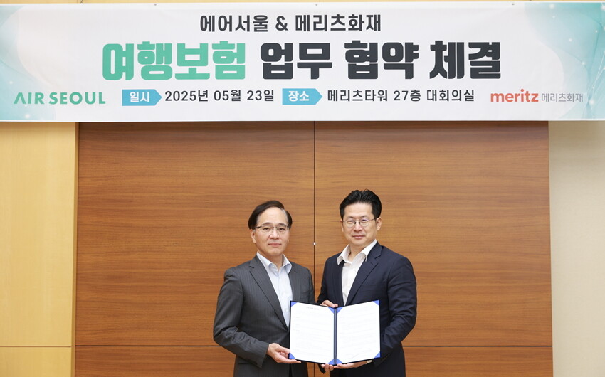 [하비엔뉴스 = 이필선 기자] 메리츠화재(대표이사 김중현)는 서울 강남구 메리츠타워에서 에어서울(대표이사 김중호)과 해외여행자보험 및 항공권 취소위약금보상보험 관련 업무협약(MOU)을 체결했다고 26일 밝혔다.