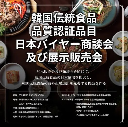 이번 행사는 건강하고 고급스러운 한국 전통식품을 일본 현지 소비자와 바이어에게 알리는 자리로, 협의회 소속 22개 업체가 참가해 다양한 전통식품을 선보인다.