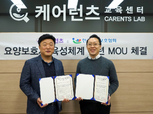 | ▲ 이경규 한국요양보호협회 상무이사와 박지성 케어런츠 대표가 업무협약 후 기념촬영을 하고 있다. [사진=케어런츠] |
