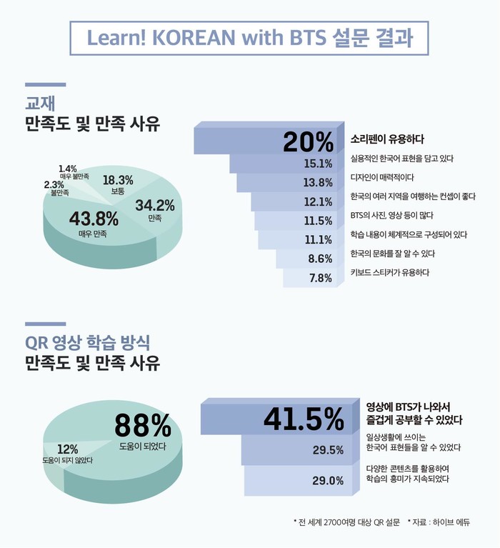 교재 내 QR 코드를 찍어 영상과 함께 학습하는 방식에 대한 만족도도 높게 나타났다. ‘Learn! KOREAN with BTS’ 교재 곳곳에 심긴 QR 코드를 휴대폰으로 스캔하면 연관된 방탄소년단의 영상 콘텐츠를 시청할 수 있는데, 응답자의 88%가 이 방식이 ‘학습에 도움이 됐다’고 답했다. QR 코드 영상이 구체적으로 어떤 점에서 학습에 도움이 됐는지를 묻는 질문에 응답자들은 ‘영상에 방탄소년단이 나와 즐겁게 공부할 수 있었다’, ‘일상 생활에서 쓰이는 한국어 표현들을 알 수 있었다’, ‘다양한 콘텐츠를 활용해 학습을 흥미롭게 지속할 수 있었다’고 답했다.