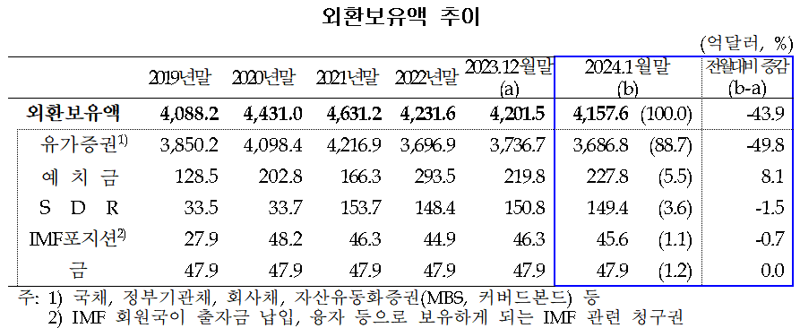 세부적으로는 유가증권 3686억8000만달러(88.7%), 예치금 227억8000만달러(5.5%), SDR 149억4000만달러(3.6%), 금 47억9000만달러(1.2%), IMF포지션 45억6000만달러(1.1%)다.