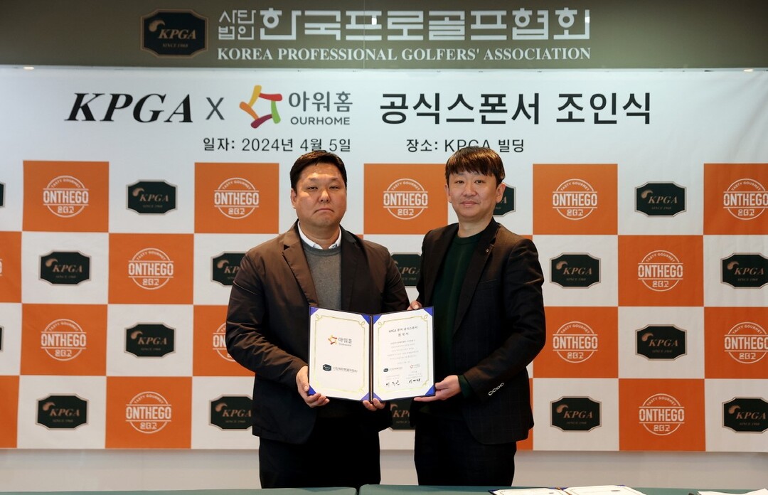 지난 5일 경기도 성남시 KPGA 본사에서 열린 ‘2024 아워홈-KPGA 공식 스폰서 조인식’에서는 이우진 KPGA 전무이사와 이재화 아워홈 HMR 사업부장 등 주요 관계자가 참석해 향후 상호 협력에 대해 논의했다.