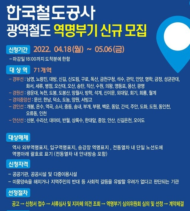 안종기 코레일 광역신사업처장은 “많은 기관 유치로 고객들이 역 주변 공공기관과 시설을 쉽고 편리하게 이용할 수 있도록 역명부기 사업을 공정하게 진행하겠다”고 밝혔다.