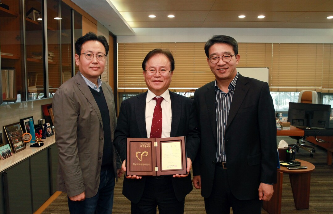 | 조항목 대표이사(가운데)와 이상근 사회공원위원장(오른쪽), 한승구 동반성장팀 차장이 감사패를 받은 후 기념촬영을 하고 있다. [사진=] |