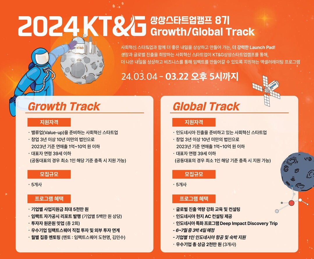 모집 대상은 창업한 지 3년 이상 10년 이내 시드 단계 팀을 위한 ‘그로스 트랙’과 인도네시아 진출을 희망하는 시드 단계 팀을 위한 ‘글로벌 트랙’의 2가지다.
