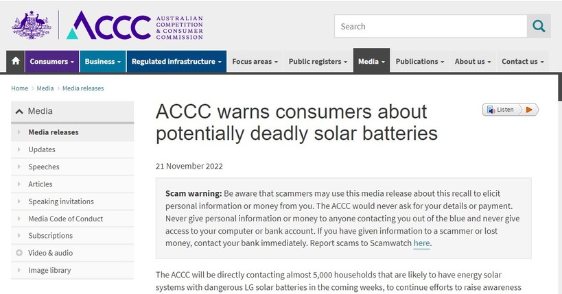 ACCC는 또 LG에너지솔루션의 배터리를 사용해 만든 태양광 PV 시스템용 배터리 저장 장치가 있는 5000여곳의 가정에 연락을 취하는 등 배터리 리콜을 독려하고 있다.