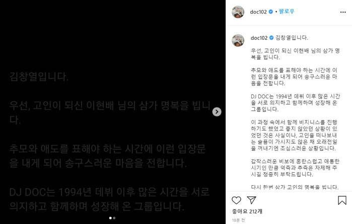 김창열은 "DJ DOC는 1994년 데뷔 이후 많은 시간을 서로 의지하고 함께하며 성장해 온 그룹"이라며 "이 과정 속에서 함께 비지니스를 진행하기도 했었고 좋지 않았던 상황이 있었던 것은 사실이나, 고인을 떠나보내는 슬픔이 가시지도 않은 채 오래전일을 꺼내기엔 조심스러운 상황"이라고 입장을 전했다.