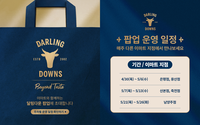 [HBN뉴스 = 정동환 기자] 호주 프리미엄 와규 브랜드 달링다운이 5월 26일까지 이마트 5개 점포에서 순회형 팝업을 운영한다. 은평점과 용산점을 시작으로 산본, 죽전, 남양주점까지 이어지는 릴레이 일정으로 구성됐다.